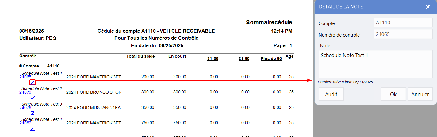 Pour utiliser cette fonction : ouvrez n'importe quel rapport de cédule, accédez à la vue détaillée et voyez comment les deux types de notes sont intégrés convenablement à vos rapports de transactions.