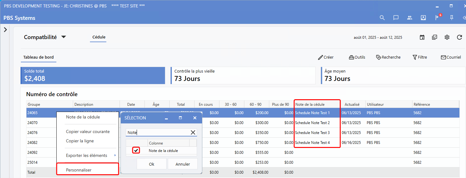 Vue détaillé du tableau de bord Cédule > Clic droit > Personnaliser > Note détail et Note de la cédule