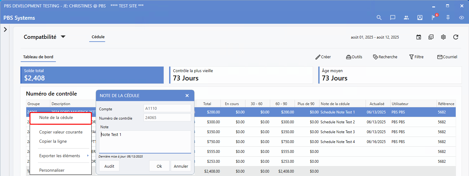 Tableau de bord Cédule > Clic droit sur une ligne de contrôle > Note de la cédule