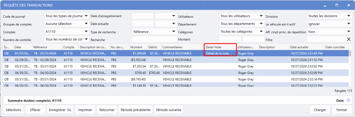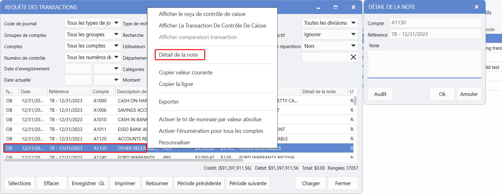 Requête des transactions > Ajouter un compte > Charger > Clic droit sur une transaction > Détail de la note