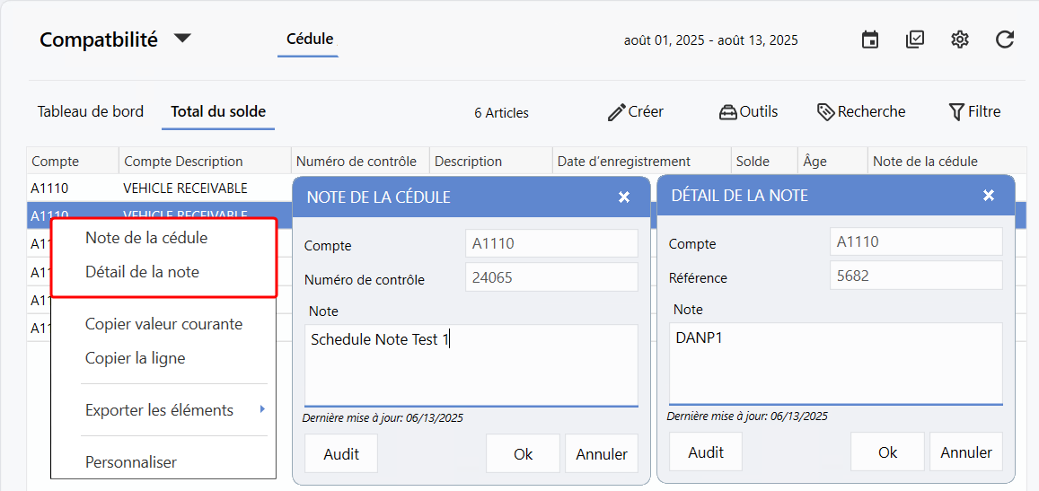 Tableau de bord Cédule > Vue détaillée > clic droit sur une ligne d'une transaction >Note de la cédule ou Détail de la note