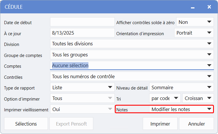 Comptabilité > Grand livre > Rapports > Cédule > Sélectionner un compte > Menu déroulant des Notes > Modification des notes > Choisir Afficher les notes