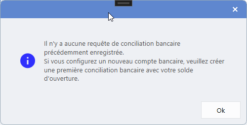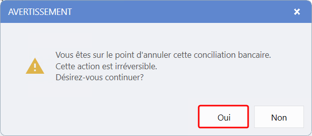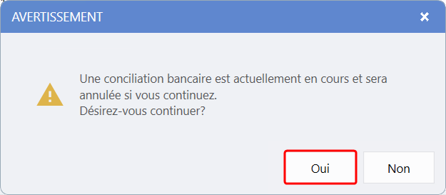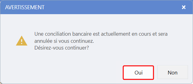 S'il existe une conciliation bancaire en cours, un message d'avertissement s'affichera pour vous informer qu'elle sera remplacée. Le rapprochement existant sera donc effacé et remplacé.