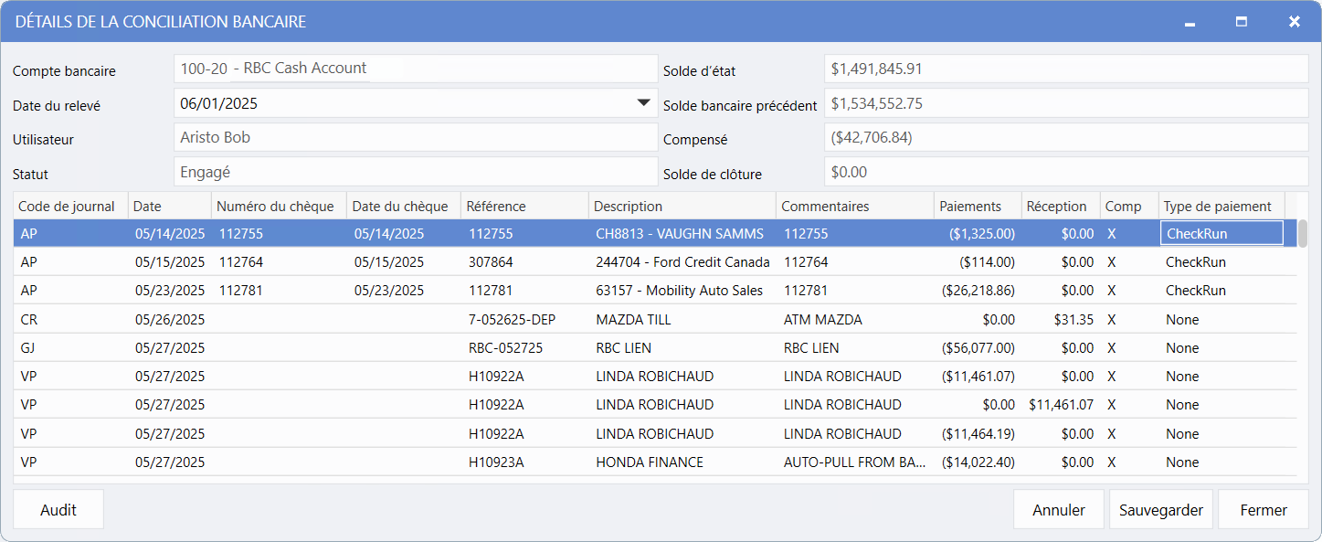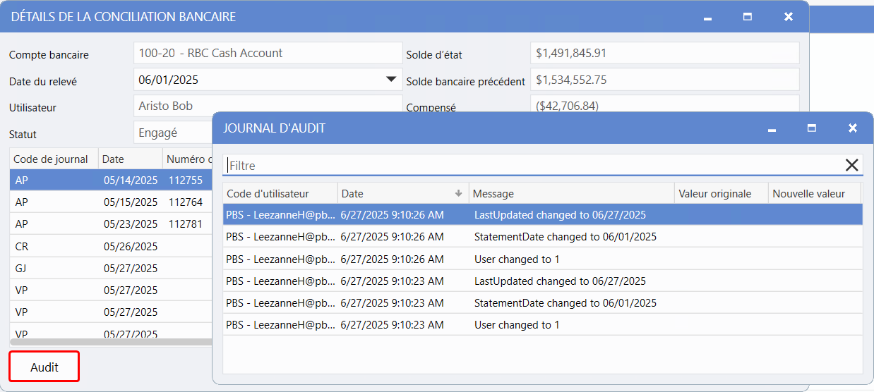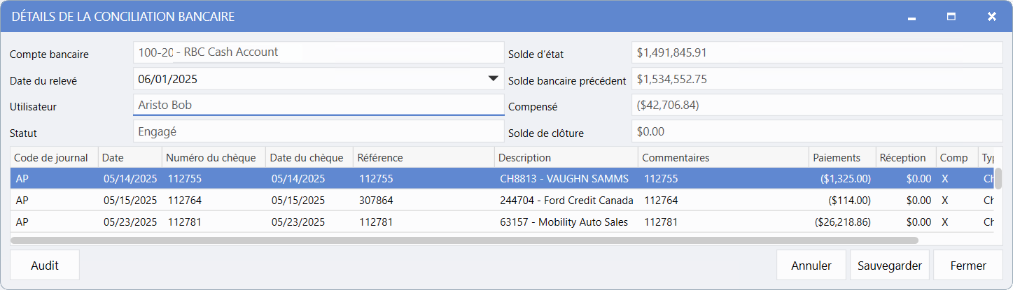 La fenêtre Maintenance bancaire a maintenant un suivi automatique des conciliations grâce à deux champs importants:
