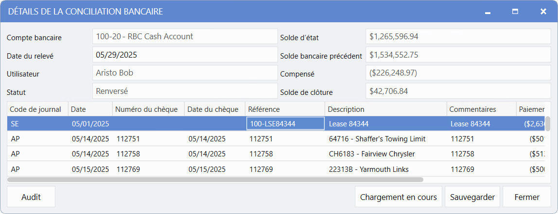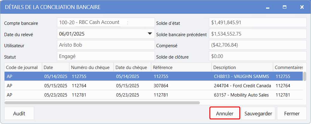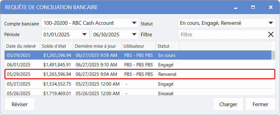 Le système restaure la conciliation bancaire avec les mêmes transactions engagées et met à jour le montant et la date du relevé à partir de la conciliation renversée.