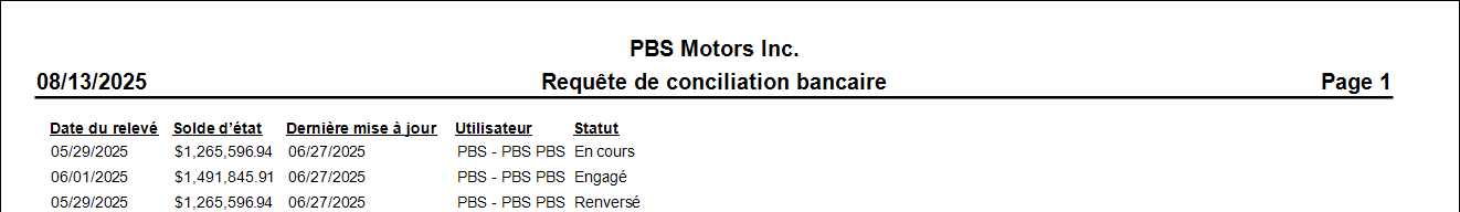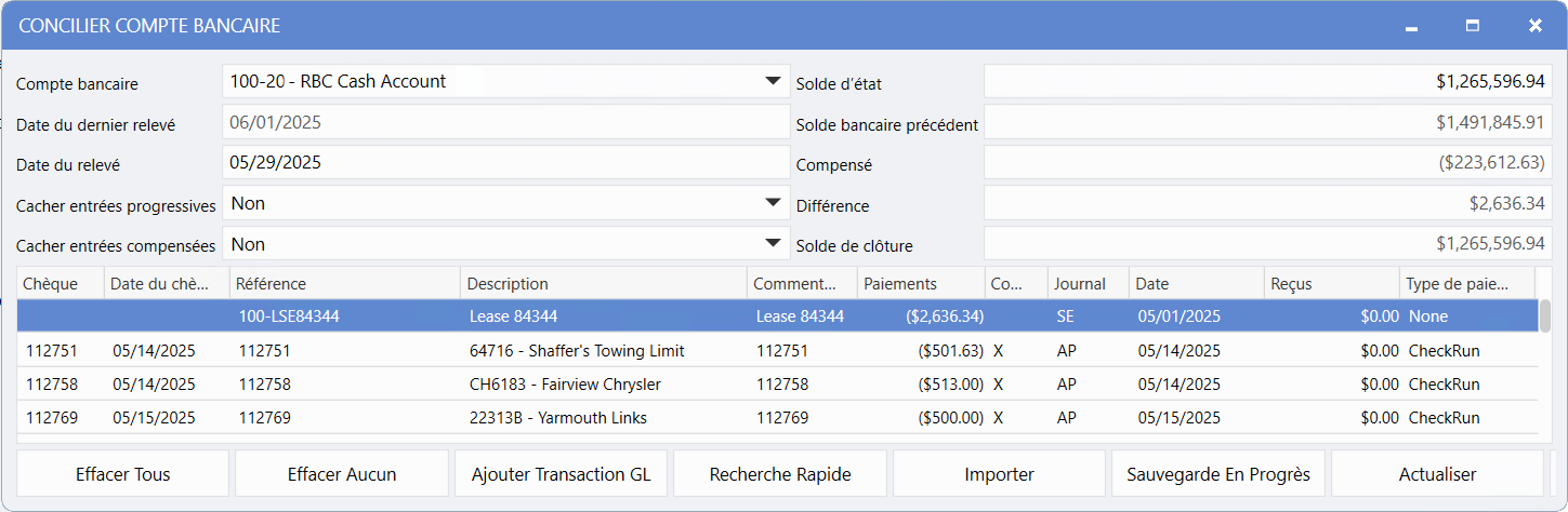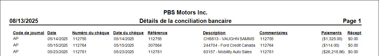 Accès sans interruption : Consultez les conciliations sans devoir accéder à l'écran du compte bancaire, ce qui évite les blocages de données qui pourraient nuire à d'autres processus, comme l'impression des chèques.