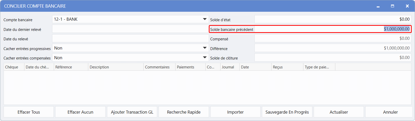 Pour établir le solde bancaire initial, les utilisateurs peuvent simplement saisir le montant dans le champ Solde bancaire précédent lors de la première conciliation. Cela servira de point de référence pour toutes les conciliations futures.