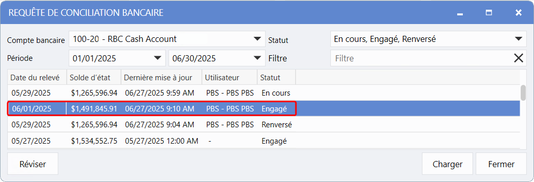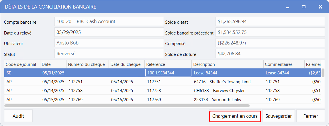 - Requis afin de pouvoir charger une conciliation bancaire renversée à un statut En progrès.