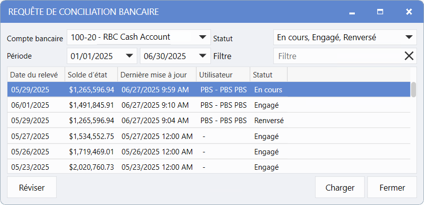 La fenêtre Requête de conciliation bancaire offre une vue d'ensemble de toutes les conciliations de comptes de banque pour une période de temps donnée, et fonctionne de façon similaire aux autres écrans de recherche à l'intérieur du logiciel.