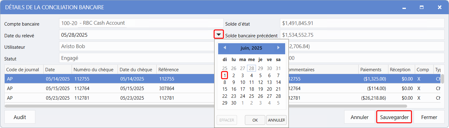 Advenant que des erreurs soient identifiées suite à la validation d'une conciliation, les utilisateurs pourront maintenant modifier la date du relevé bancaire directement à partir de la fenêtre Détails de la conciliation bancaire. Ceci éliminera le besoin de contacter le soutien technique afin de demander des corrections de date pendant la fermeture de fin de mois.
