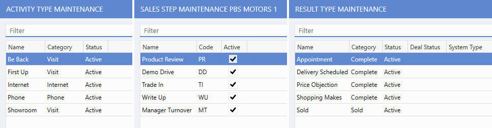 Deal > Maintenance > Sales Activity > Activity Type / Result Type / Sales Step