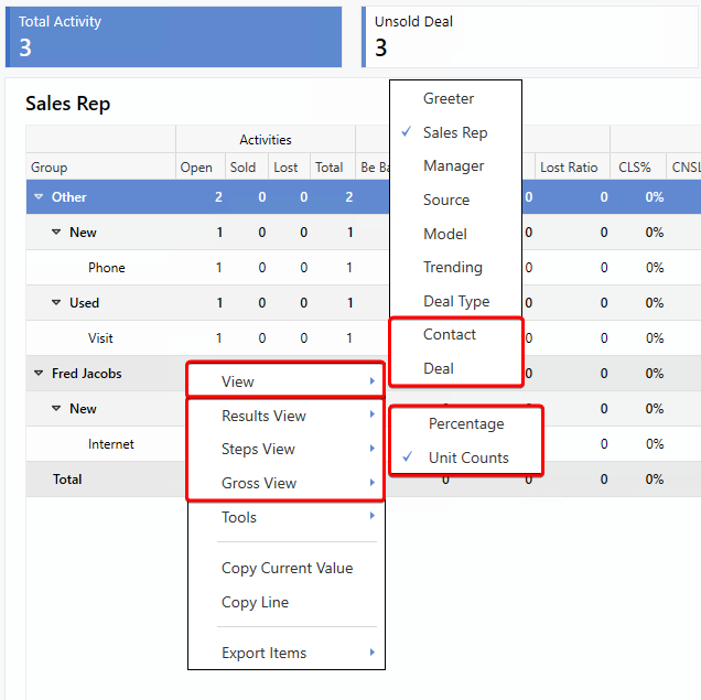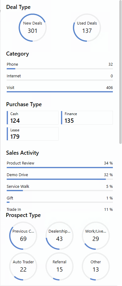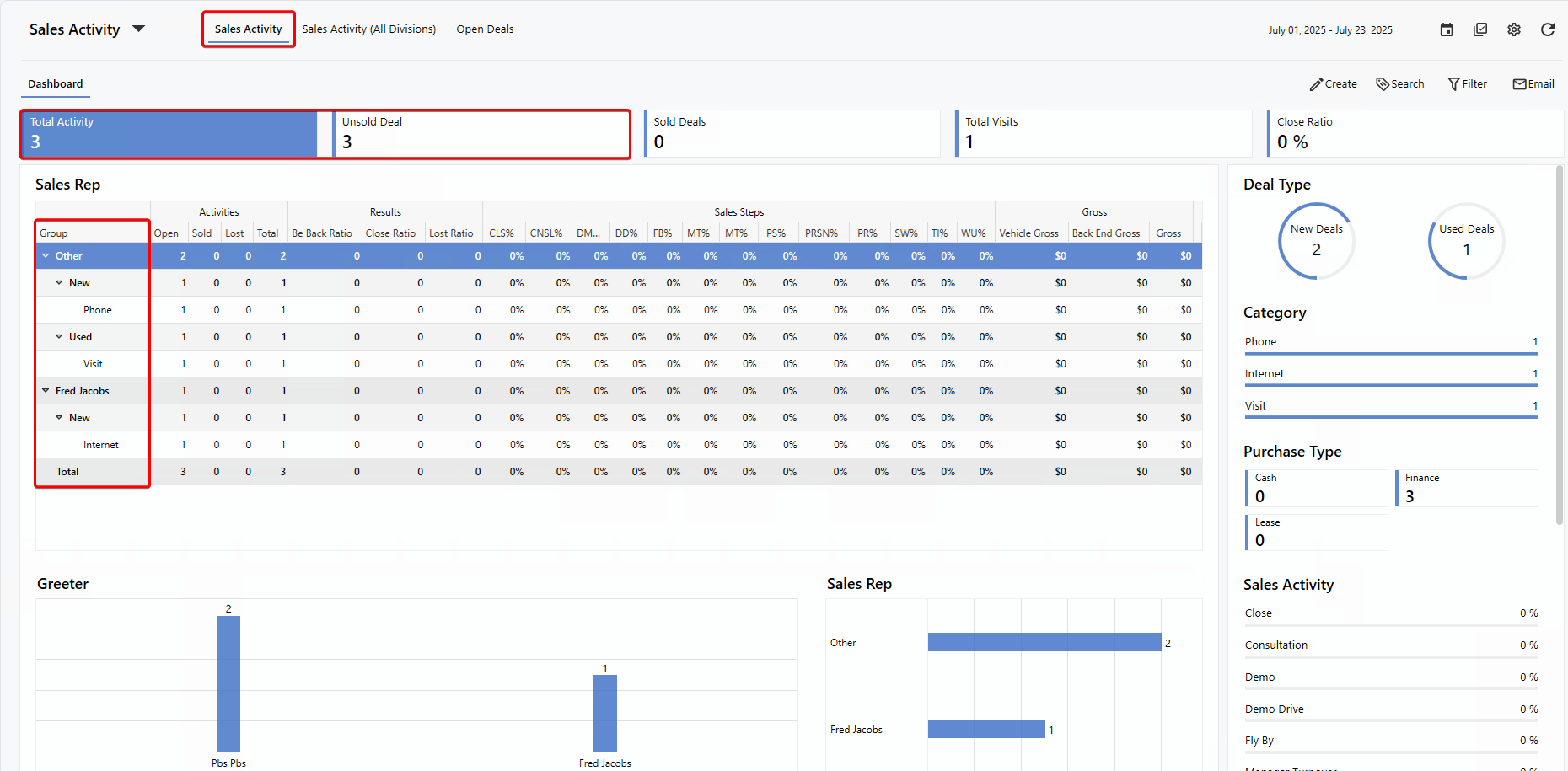 deals has been added to each group in the Dashboard Summary, organizing activity data by deal type. This makes it easier to identify whether a Sales Activity relates to a new or used vehicle.