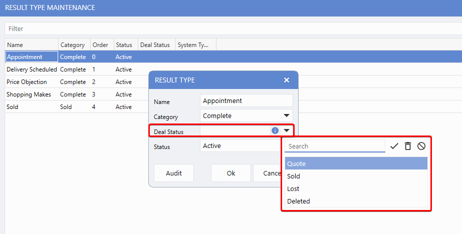 field. When a result type is applied, the corresponding deal status is automatically set. If the Category is marked
