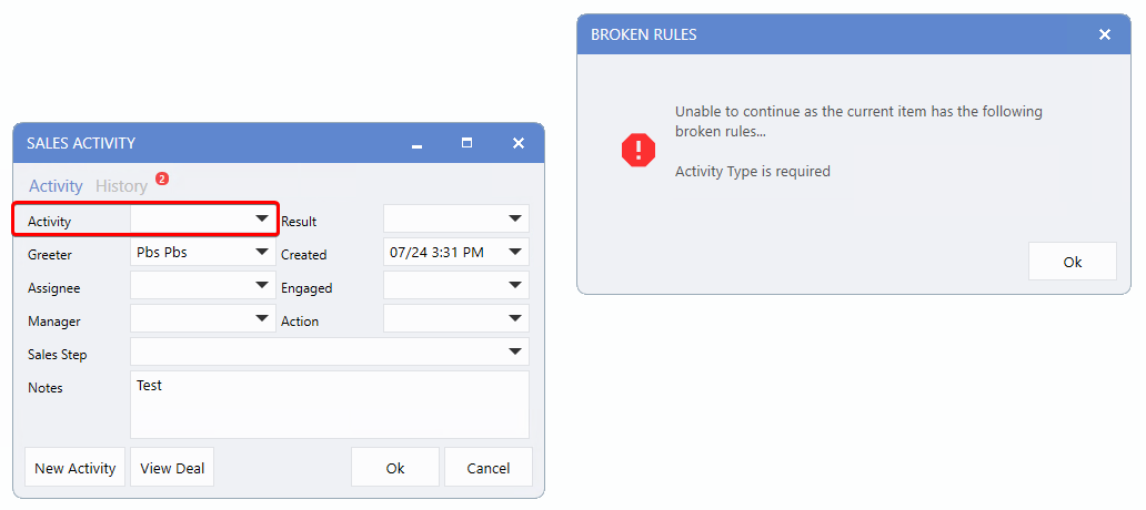 is required when creating a Sales Activity - attempting to save without one will trigger a broken rule and prevent the entry from being saved.