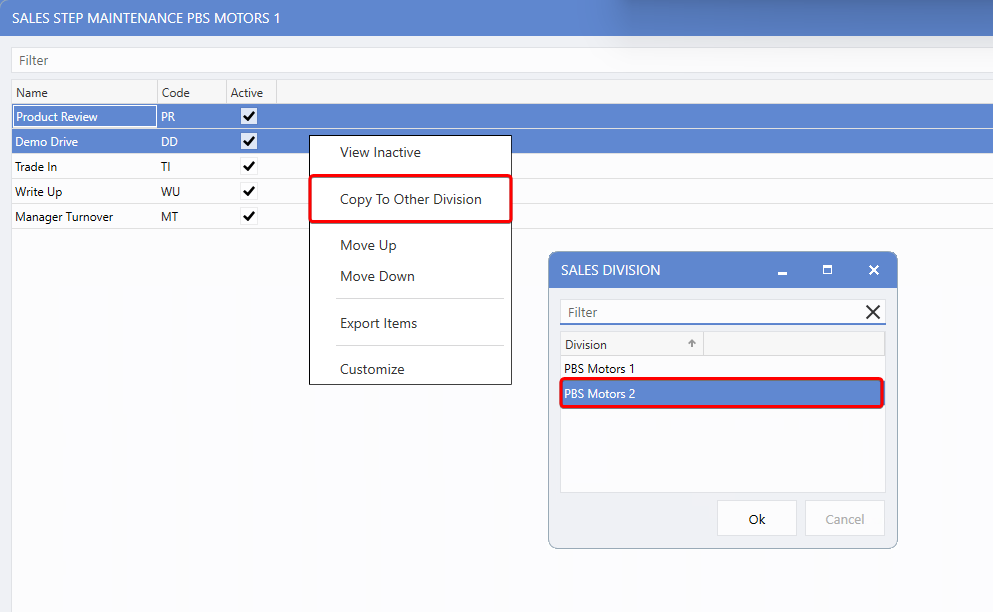 Settings from all three maintenance areas can now be copied to other divisions via right-click >