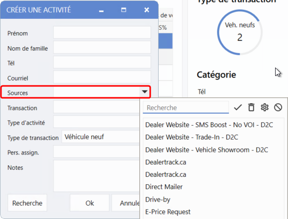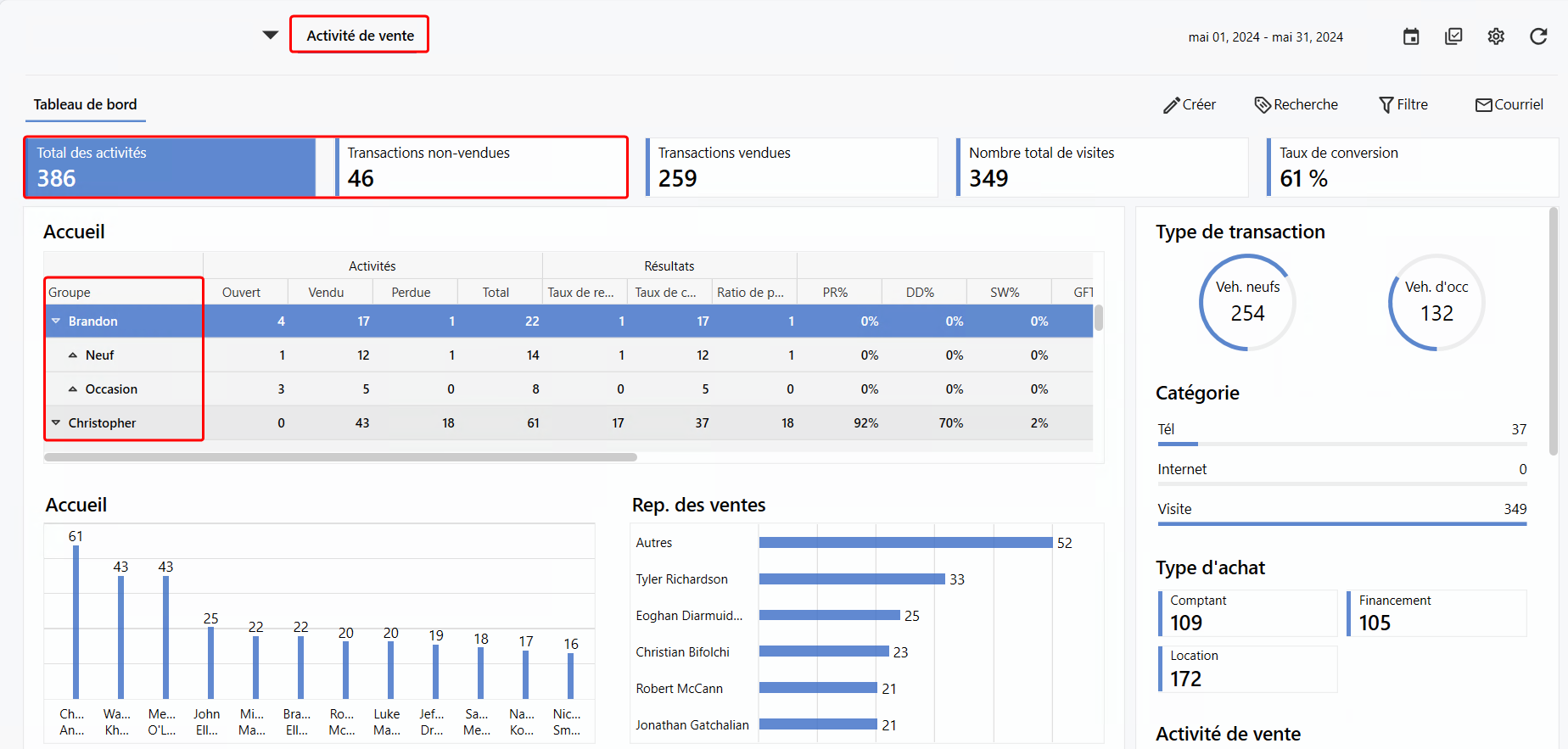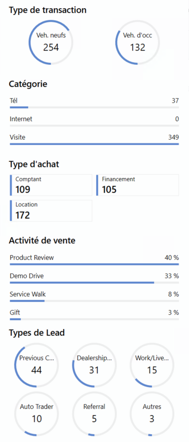 a été ajouté à chaque groupe dans le sommaire du tableau de bord. Il organise les données d'activité par type de transaction et permet d'identifier plus facilement si une activité de vente concerne un véhicule neuf ou d'occasion.