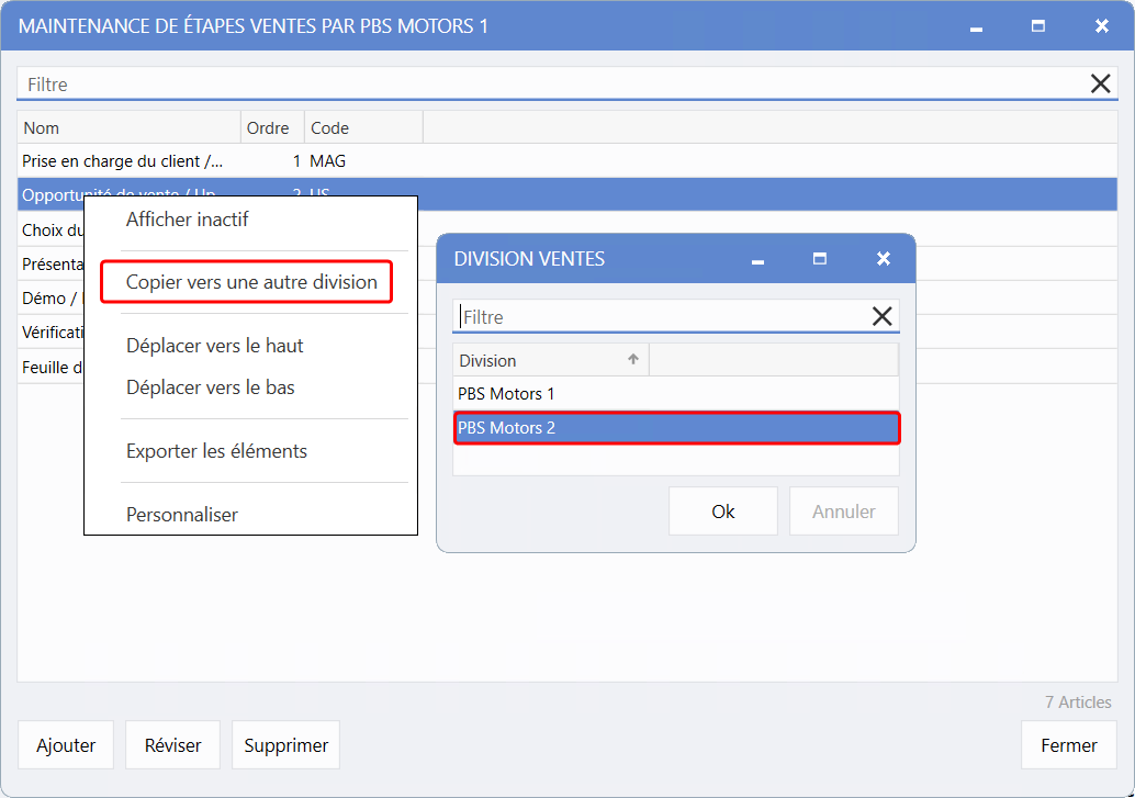 Les configurations trouvées dans les trois fenêtres de maintenance peuvent maintenant être facilement copiées vers d'autres divisions en faisant un clic droit et en sélectionnant
