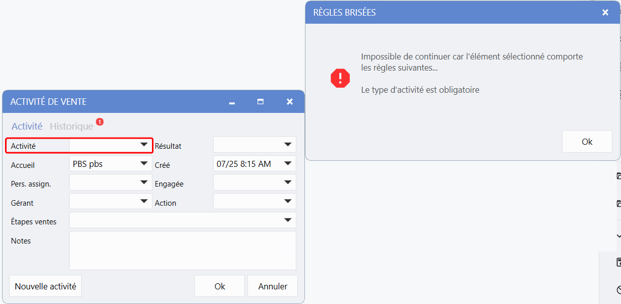 est obligatoire lors de la création d'une activité de vente; si vous tentez de sauvegarder sans en avoir choisi un, une fenêtre Règles brisées apparaitra et l'enregistrement ne pourra pas être complété.