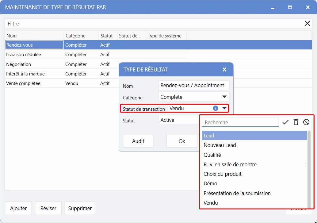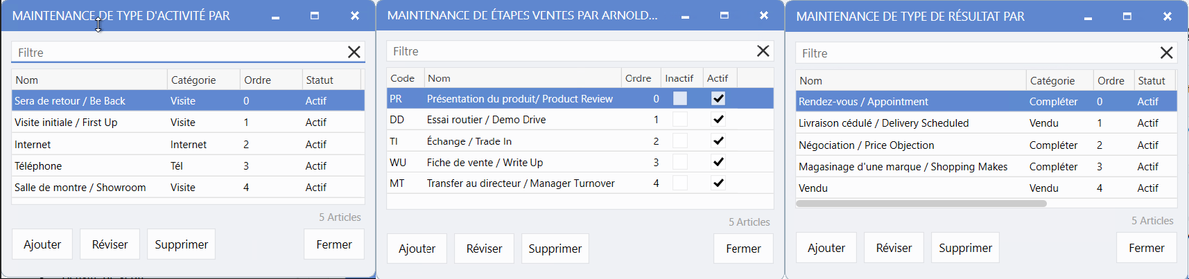 Transaction > Maintenance > Activité de vente > Type d'activité / Type de résultat / Étape ventes