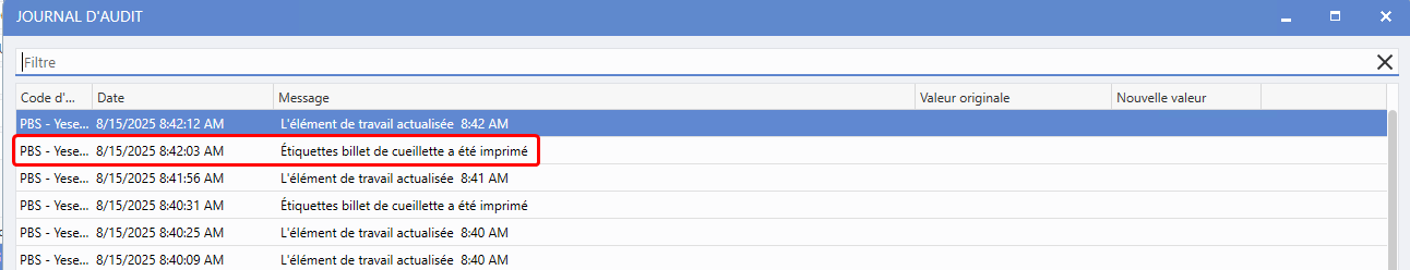 Auparavant, le journal d'audit enregistrait uniquement les travaux d'impression d'étiquettes des billets de cueillette initiés à partir du menu de droite. Suite cette mise à jour, toute impression initiée à partir du