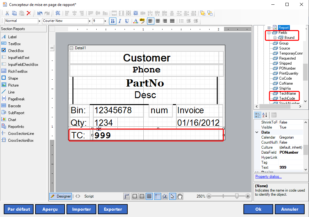 Le concepteur de mise en page d'étiquettes des billet de cueillette a été amélioré suite l'intégration de deux nouveaux champs de données :
