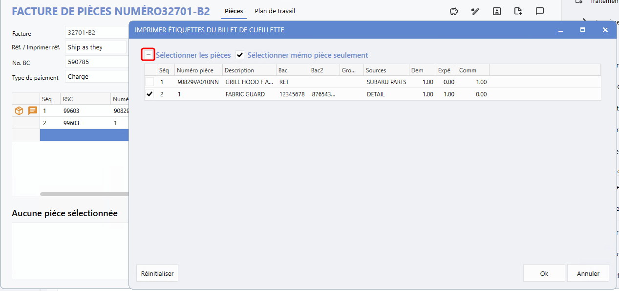 La mise en page de la fenêtre d'impression d'étiquettes de billet de cueillette aperçue dans un bon de travail, et une facture de pièces diffèrent un peu l'une de l'autre. La première groupe les pièces en fonction des lignes de demande identifiées dans le bon de travail, simplifiant le repérage et la sélection spécifique des pièces nécessitant l'impression d'une étiquette.