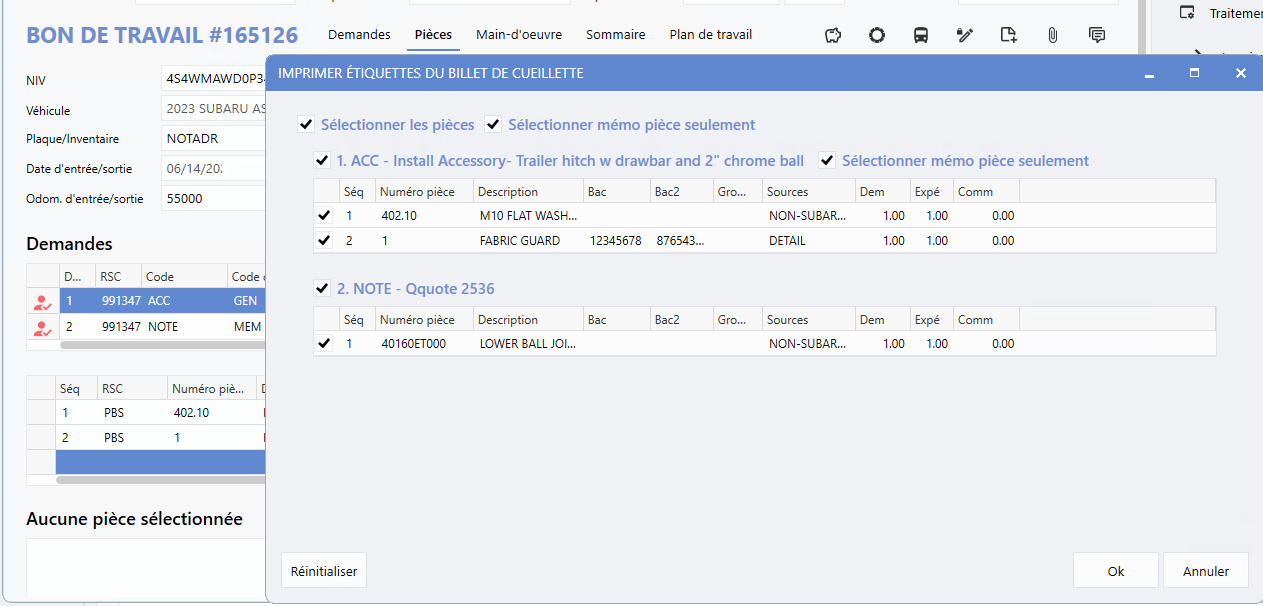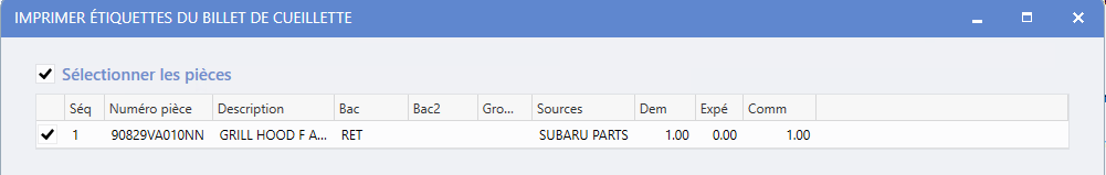 Une nouvelle fenêtre conviviale permettant l'impression d'étiquettes des billets de cueillette sera visualisée via l'option du menu de droite « Imprimer » à partir d'un élément de travail, incluant une liste avec les pièces automobiles saisies. Afin de réduire les tâches manuelles, toutes les lignes de pièces seront sélectionnées par défaut, facilitant le processus d'impression d'étiquettes.