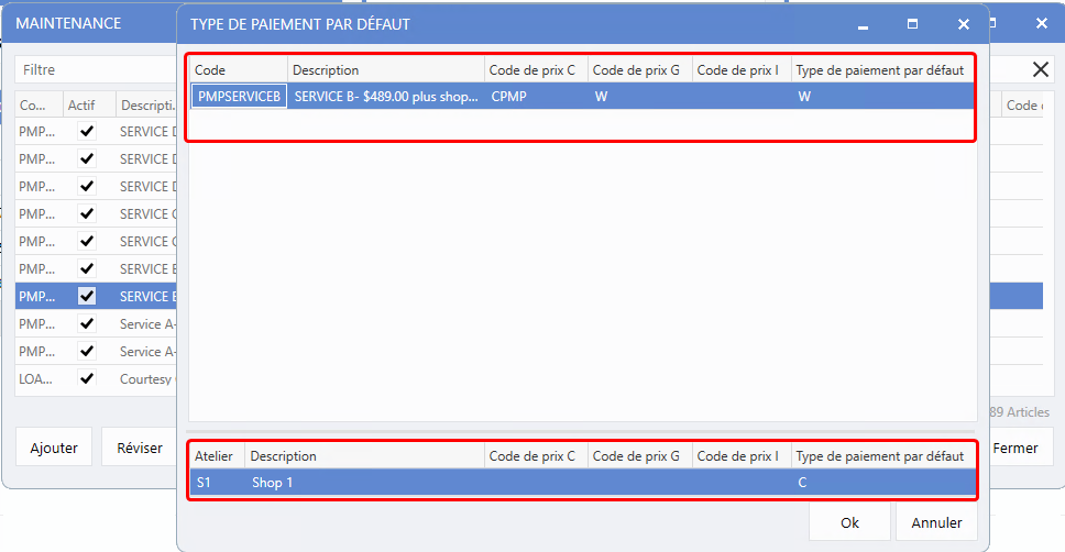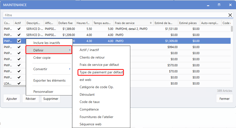Ops fixes > Bon de travail > Maintenance > Configurations de service > Codes Ops. > Clic de droite > Définir > Type de paiement par défaut