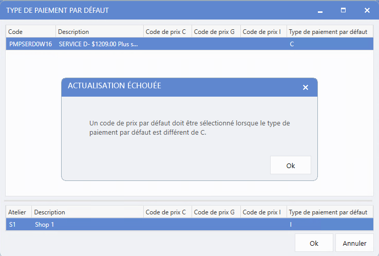 est déclenché lorsque le type de paiement par défaut est réglé à Garantie (G) ou Interne (I) sans aucun code de prix par défaut associé.