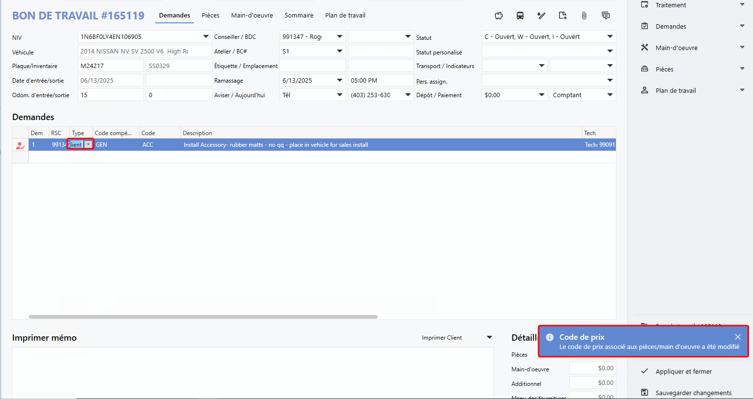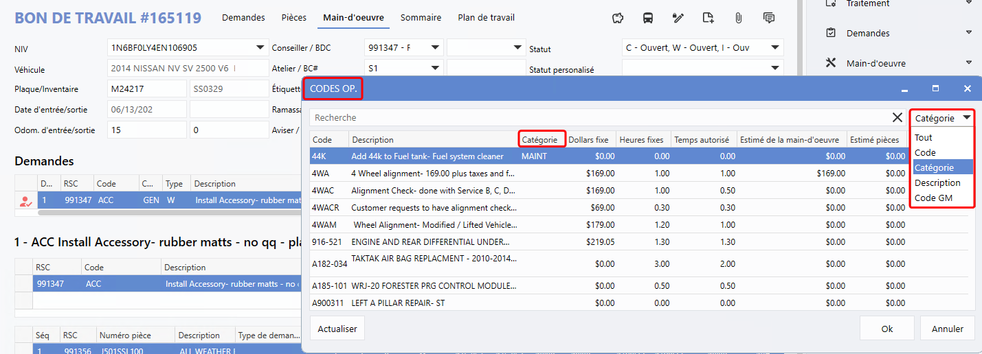 dans un bon de travail, rendez-vous, et estimation a été modifiée, facilitant l'addition des codes Ops. sur une ligne de demande ou de la main d'oeuvre; maintenant un processus plus rapide et efficace grâce à l'ajout de l'option