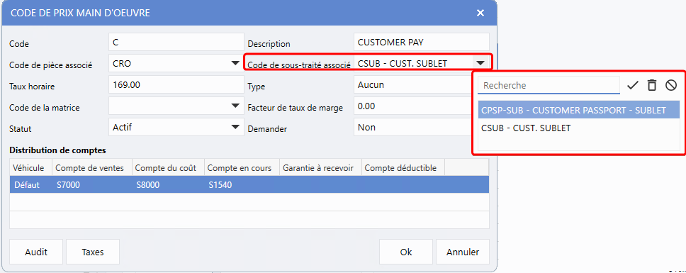 Ops fixes > Bon de travail > Maintenance > Configurations de service > Code de prix de la main d'oeuvre > Sélectionnez un code > Code de sous-traité associé