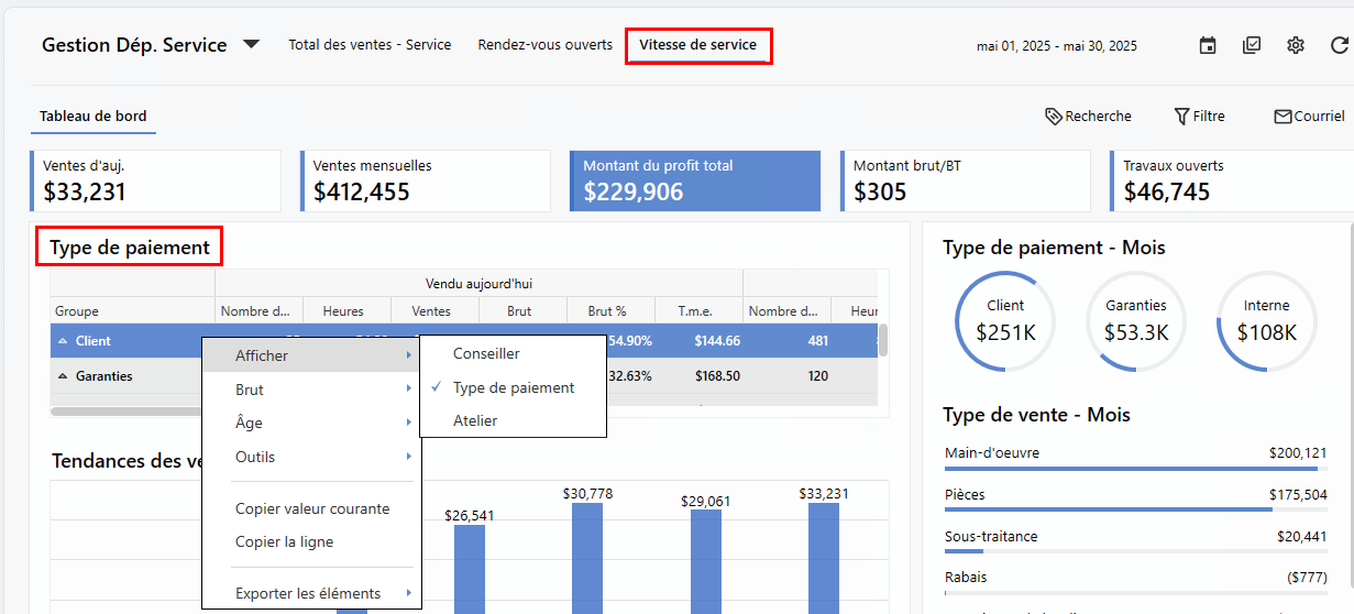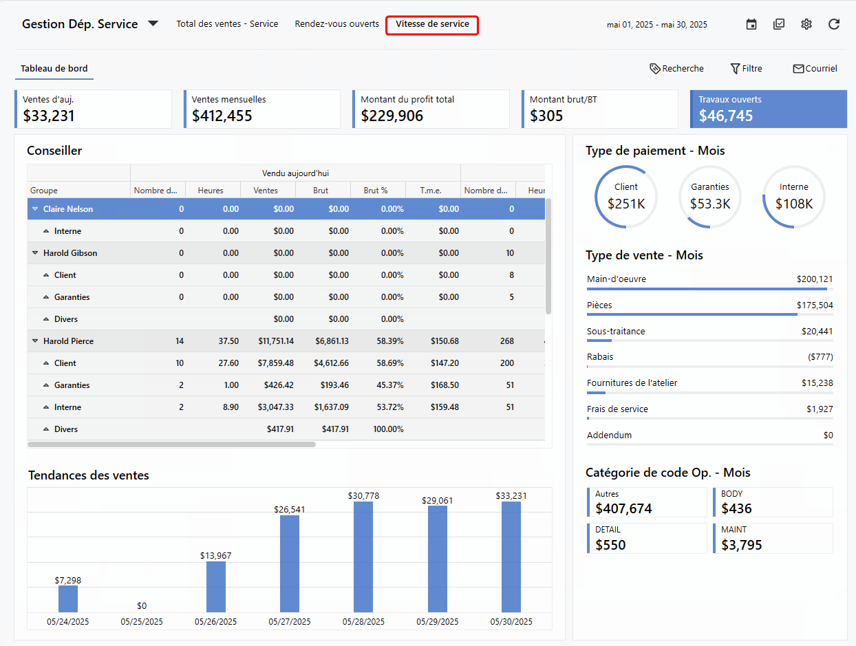 Vous aurez une vision claire de la situation avec la vue d'ensemble des informations en temps réel des activités quotidiennes, la performance depuis le début du mois, et les bons de travail ouverts. Tout au même endroit afin que vous sachiez où concentrer vos efforts.