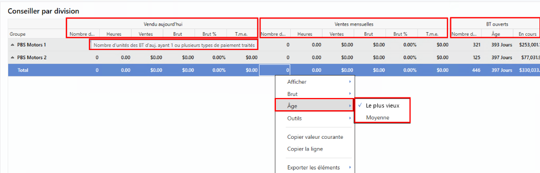 cette option offre un affichage de données flexible aux concessionnaires divisionnaires. Via une liste déroulante, vous pouvez sélectionner