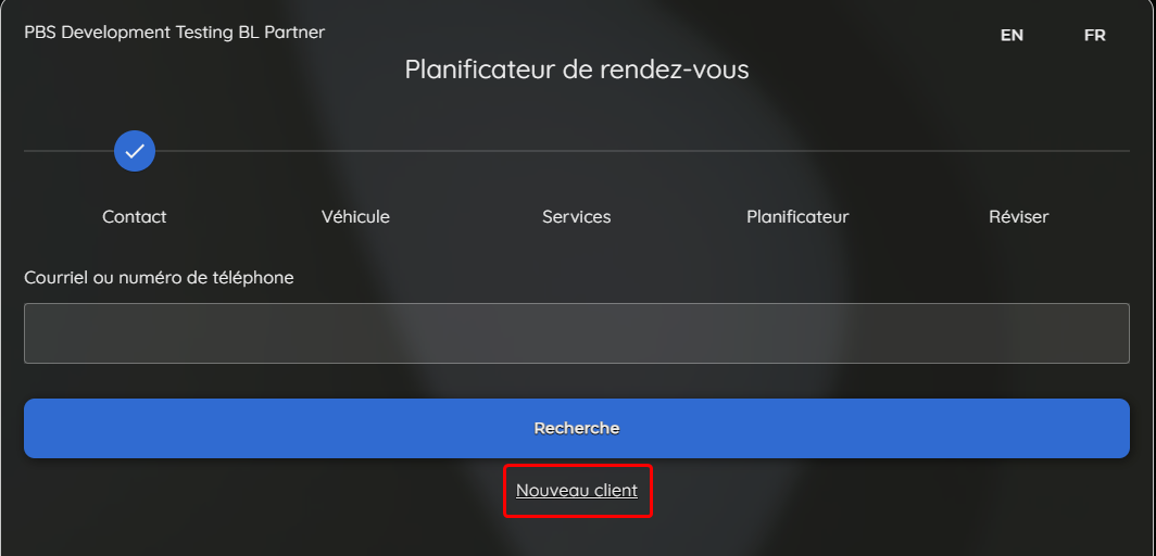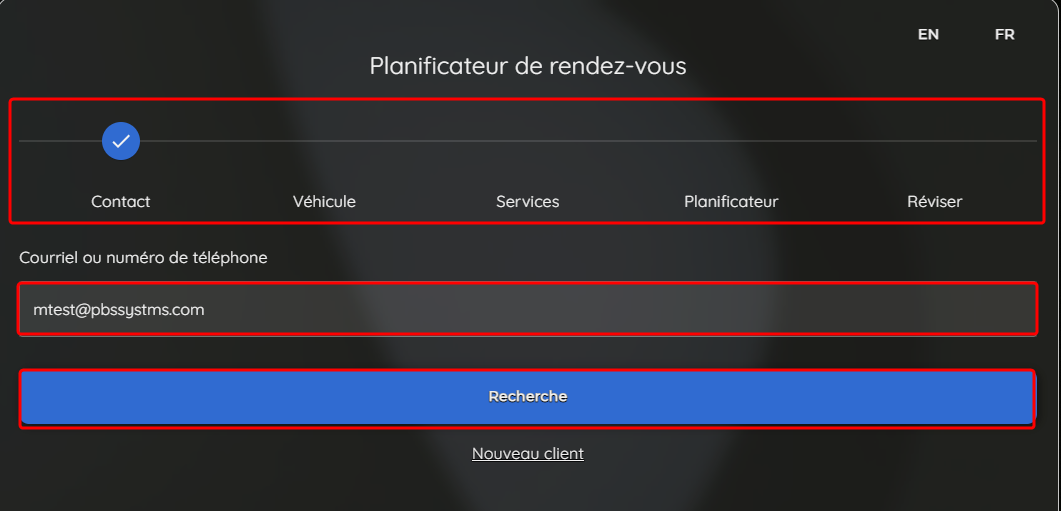 Pour les clients existants, le processus de réservation commence avec la recherche du contact. Cette étape a été simplifiée, où les utilisateurs devront saisir uniquement soit leur