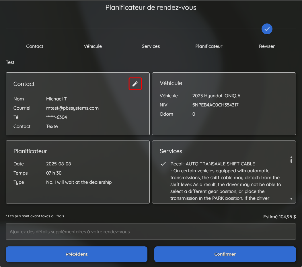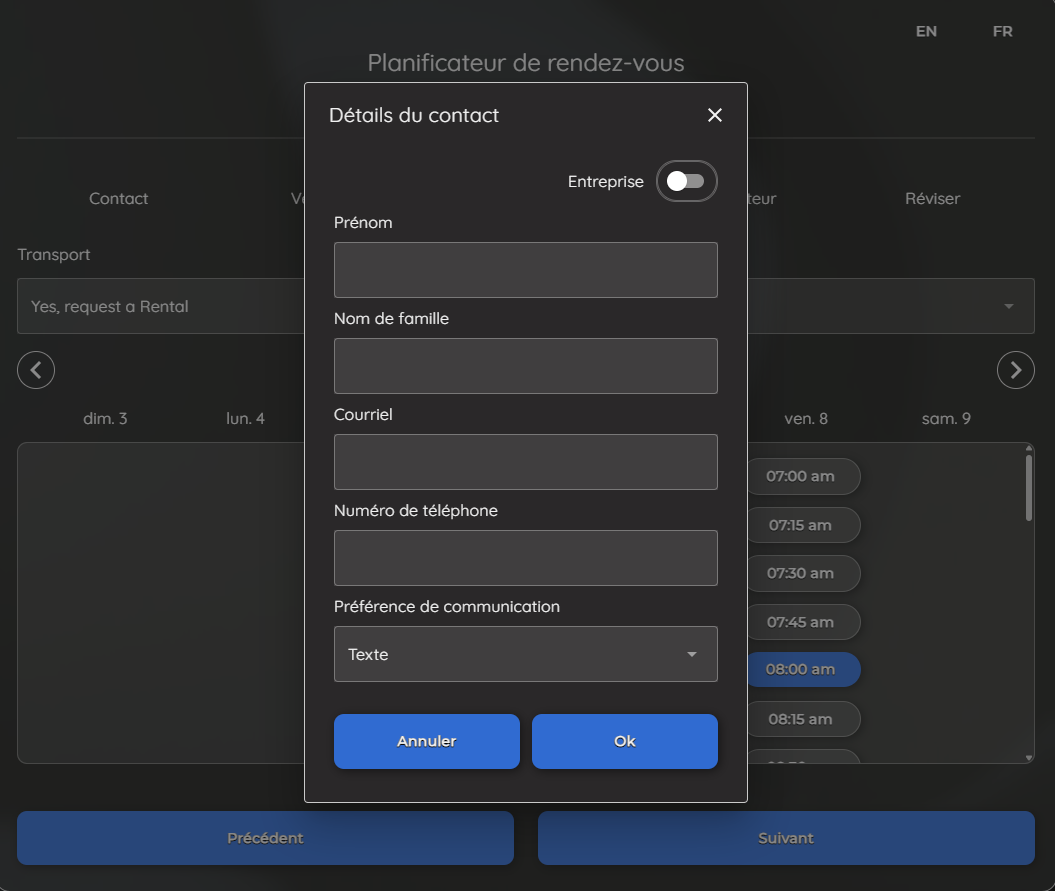 le client rencontrera les étapes Services, Transport et Planification. Une fois les détails du rendez-vous confirmés, une fenêtre s'ouvrira pendant l'étape finale, demandant leurs