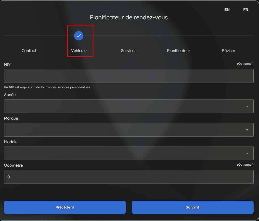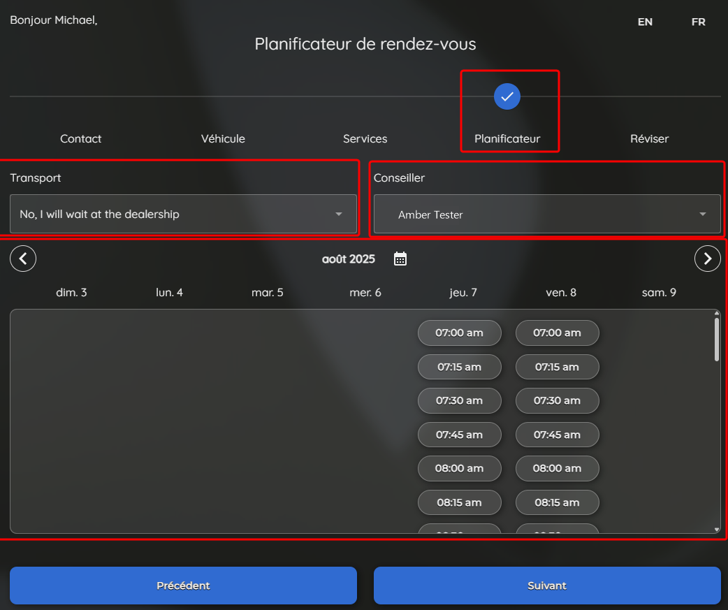 Afin d'améliorer l'efficacité, nous avons simplifié le processus de planification pour les nouveaux clients. Tous les créneaux disponibles sont présentés d'avance - avant la saisie des coordonnées - empêchant le besoin de devoir compléter chaque étape même quand il n'y a pas de disponibilité. Puisque les nouveaux clients savent habituellement quel véhicule ils vont amener au concessionnaire, la sélection