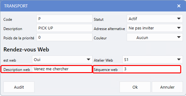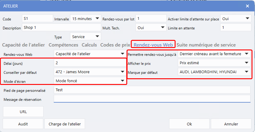 Ops fixes > Bon de travail > Maintenance > Configurations de service > Maintenance de l'atelier > Onglet Rendez-vous Web