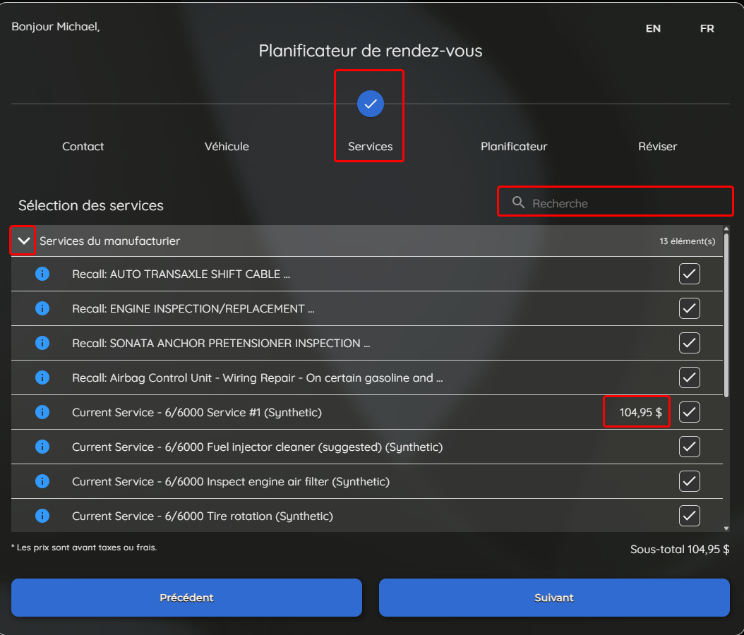 pour être affichée en haut de la liste, vous faisant gagner en temps en éliminant le besoin de défiler à travers toutes les options. Ceci est plutôt utile pour les nouveaux clients programmant des rendez-vous pour un véhicule de la même marque. Ce changement améliore l'expérience utilisateur en simplifiant le processus de planification.