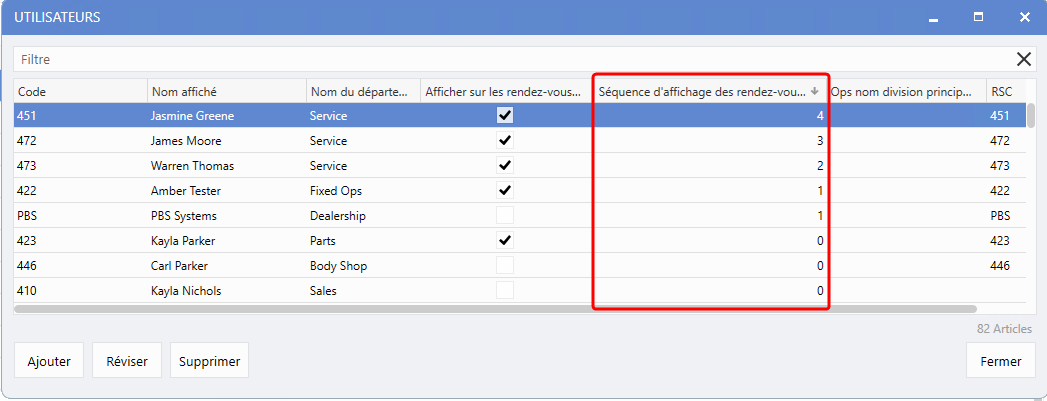 a été ajoutée au fichier de l'utilisateur. Cette fonction est particulièrement utile pour les concessionnaires ayant un conseiller de service spécifiquement désigné pour gérer la plupart de rendez-vous Web. Ceci permet de contrôler la séquence dont les conseillers seront affichés dans la liste faisant face à la clientèle, assurant l'affichage d'un conseiller spécifique en tête de la liste, en bas ou dans une autre séquence préférée.