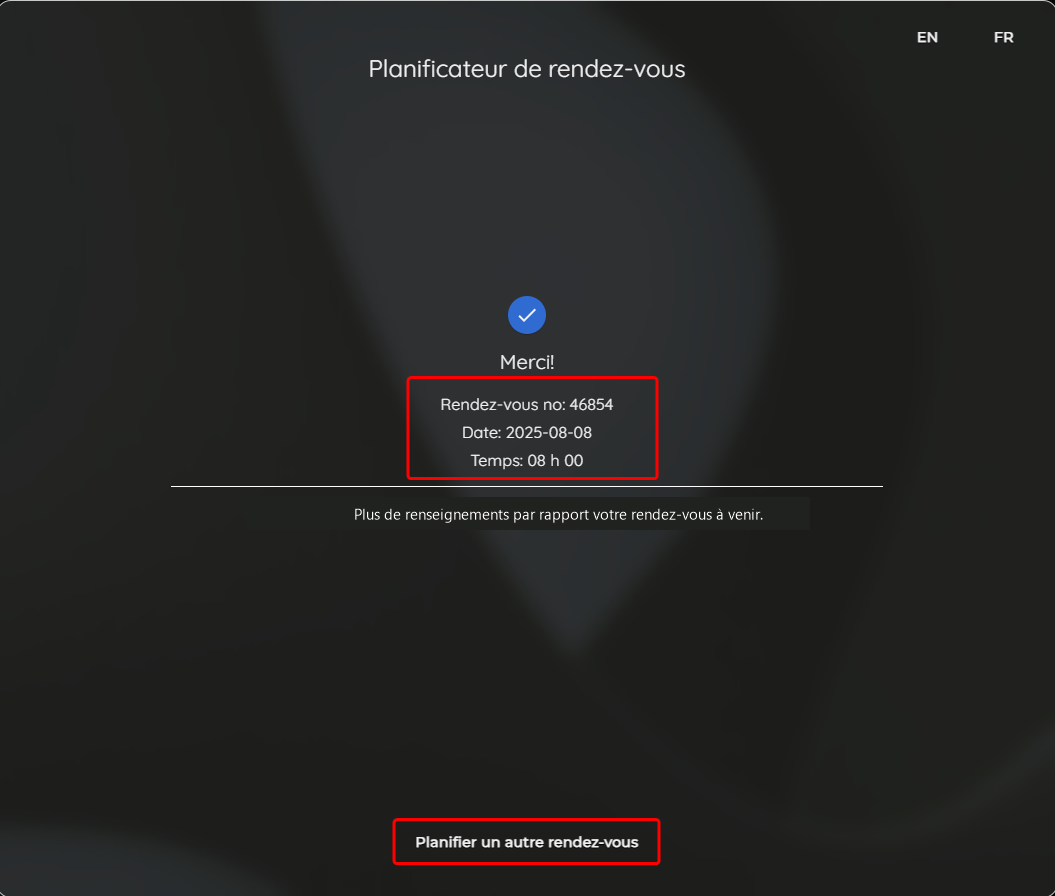 est affiché après la soumission du rendez-vous, où le numéro de rendez-vous, la date et l'heure sont affichés. Ce numéro est indispensable advenant le besoin de repérer le rendez-vous pour un client demandant une mise à jour ou une modification.