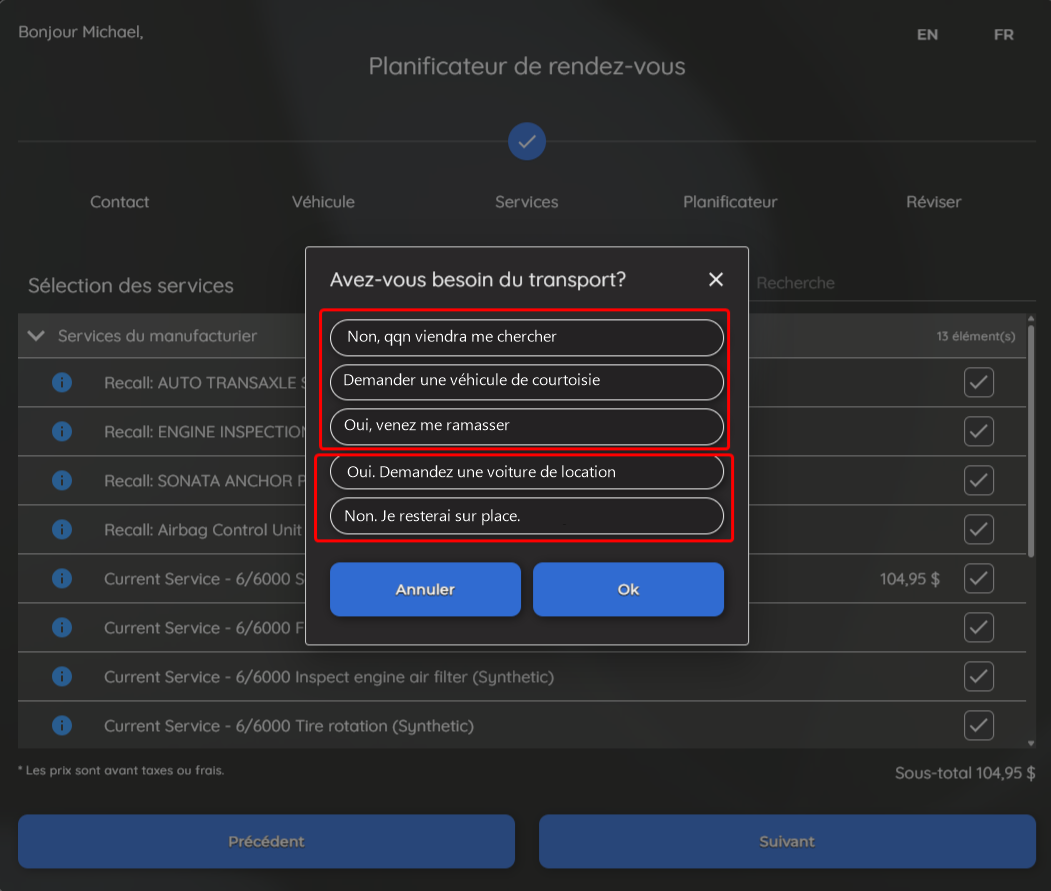 a pu laisser croire à certains qu'ils devraient attendre sur place, tandis que d'autres supposaient que cela impliquait qu'ils avaient besoin d'un transport. De même, la sélection « navette » ou « véhicule de courtoisie » a parfois laissé croire qu'un véhicule serait automatiquement prêt à leur arrivée au concessionnaire.