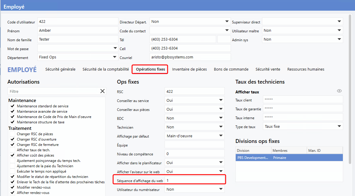Employée > Maintenance de l'utilisateur > Utilisateurs > Sélectionnez un utilisateur > Onglet Opérations fixes > Séquence d'affichage Web