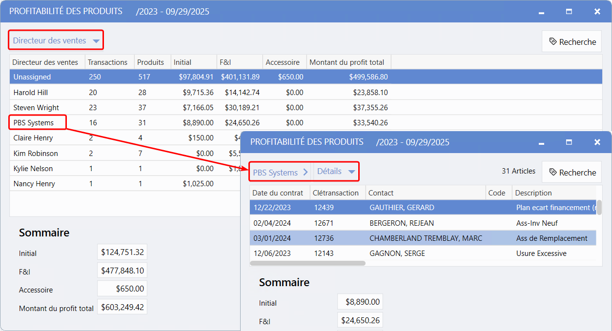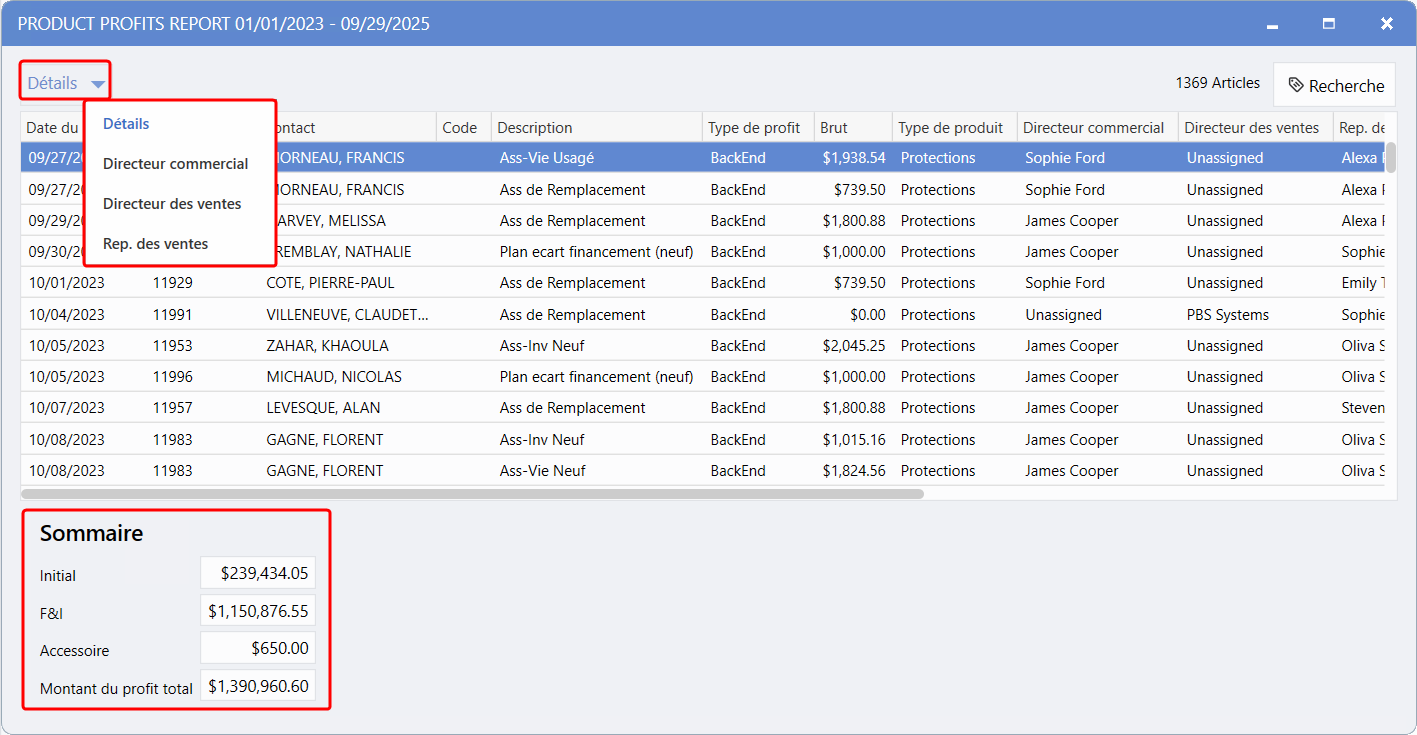 Il offre une vue d'ensemble claire du profit brut par produit et par transaction, avec des options de filtre flexibles conçues pour différents rôles, comme les représentants aux ventes, les directeurs aux ventes et les directeurs commerciaux.