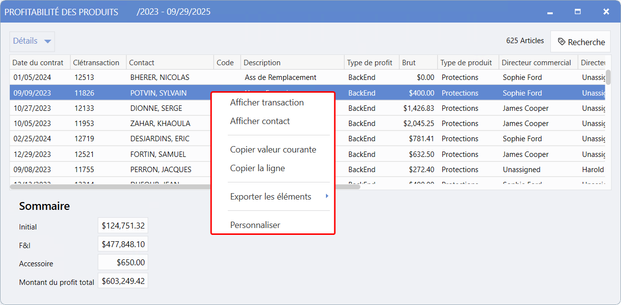 En cliquant avec le bouton droit sur n'importe quelle ligne du rapport, un menu contextuel s'ouvre avec des options supplémentaires.
