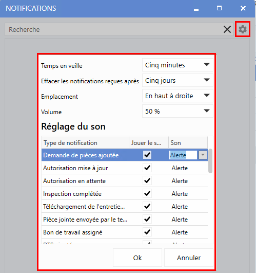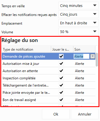 sous la colonne « Jouer le son », une alerte sonore se déclenche lors sa réception; à l'inverse, si le type de notification