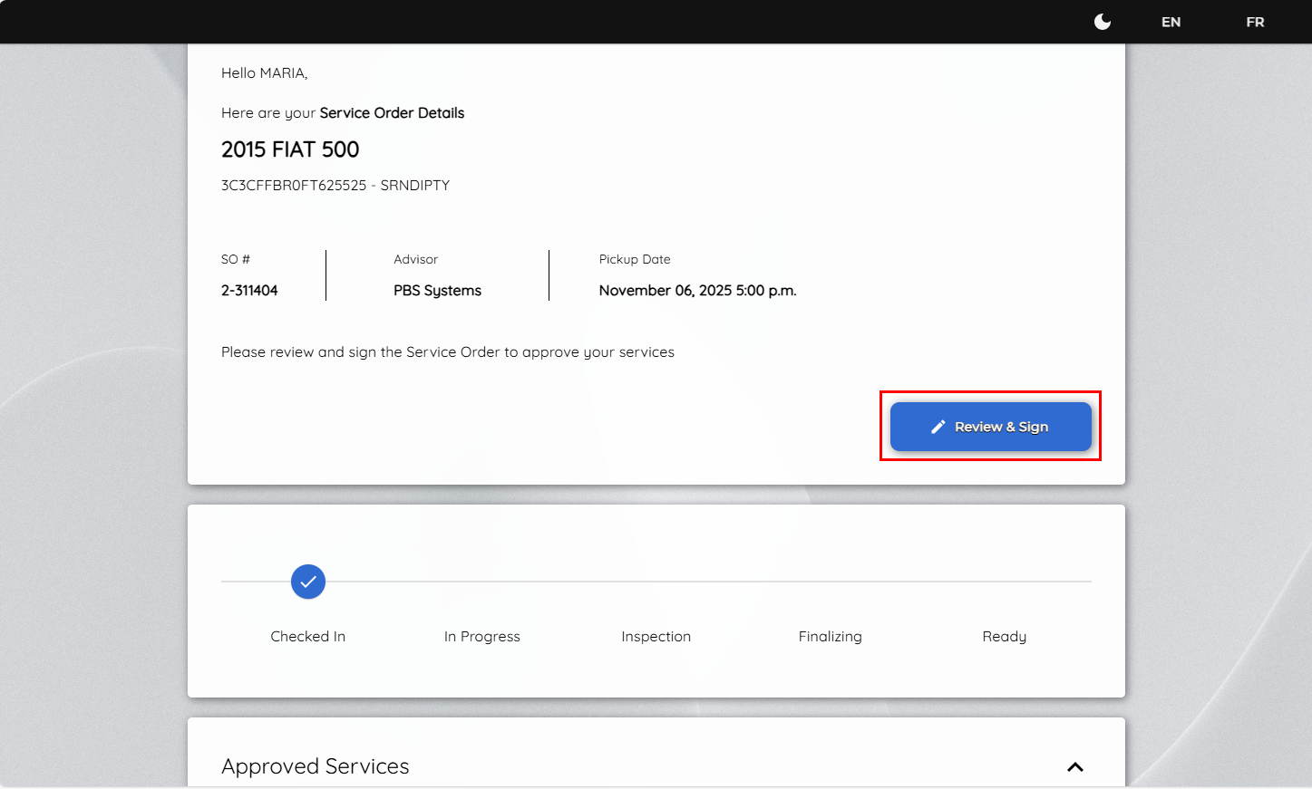 When the Customer clicks the link in the Checked In Notification that directs them to their Service Order, they will now see a new