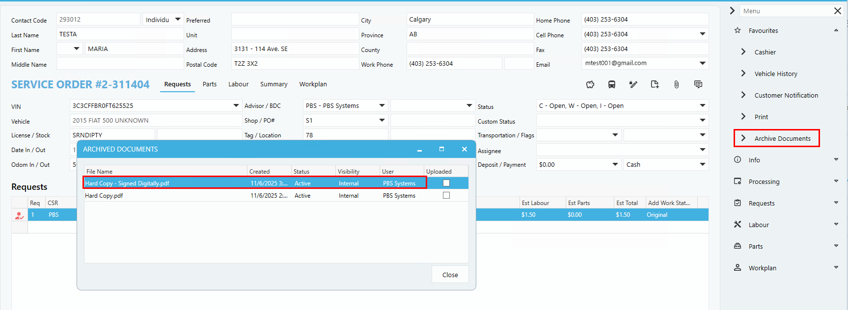 Once the Customer completes the signature, they'll see a confirmation prompt and the document will be automatically uploaded into the V10 software and stored under Archive Documents.