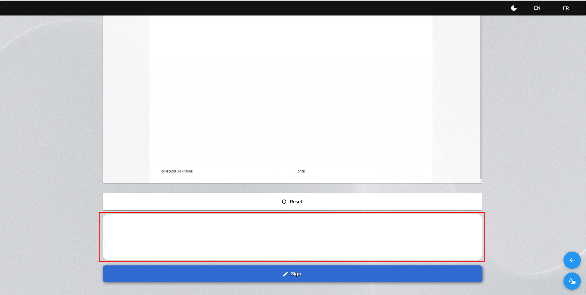 Clicking the button opens the document for the Customer to review, with a signature box displayed at the bottom.