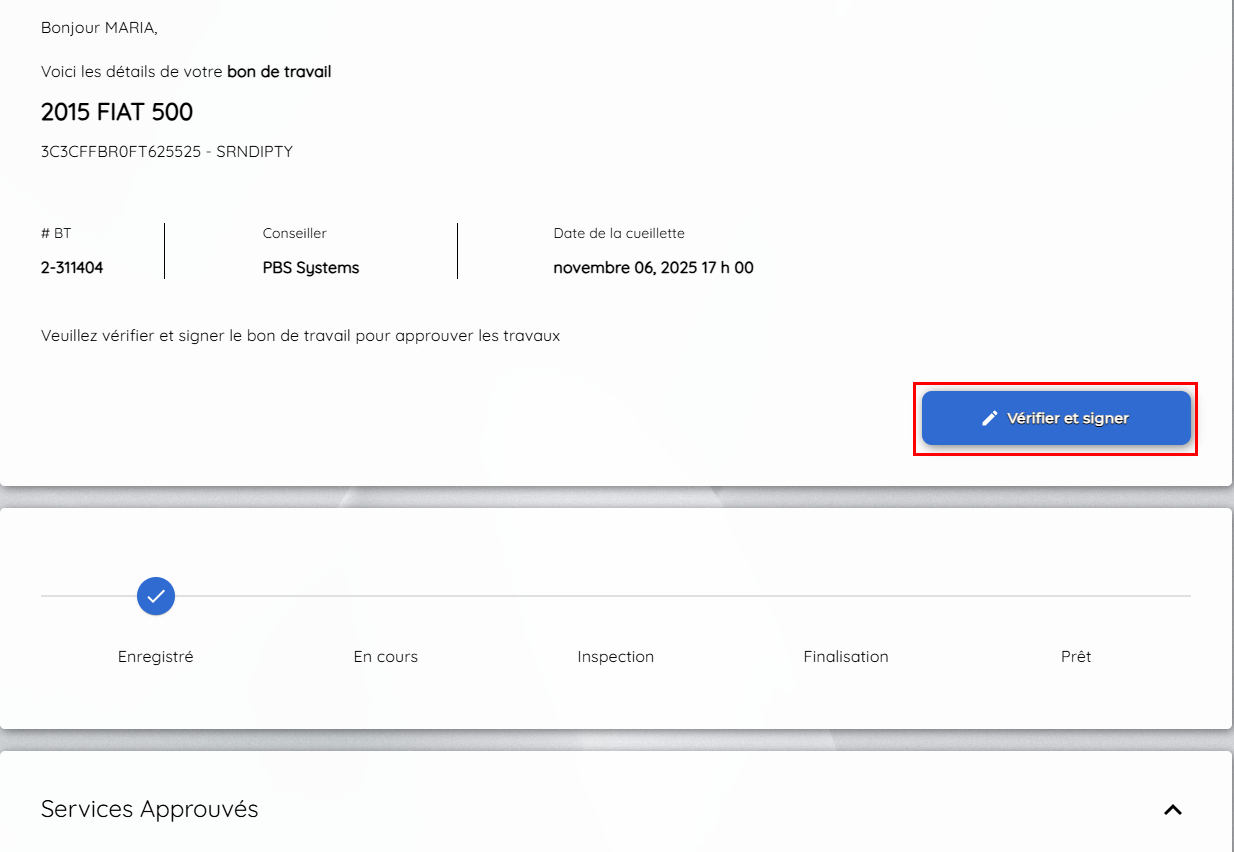 En cliquant sur le lien de la notification BT enregistré, le client est dirigé vers le bon de travail où le bouton